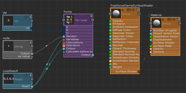 - 将“字符串”(String)的“输出”(Output)值连接到“For 循环”(For Loop)节点的“运算符”(Operators)属性。“For 循环”(For Loop)会将纹理采样的结果添加到“循环结果”(Loop Result)变量中。