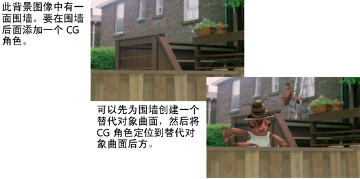 图像文件背景是 2D 图像,位于场景中的对象后面。但是,可以通过创建表示背景图像中对象的“替代对象”曲面来模拟 3D 背景。场景中的对象随后可以: