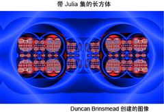 - 带 Julia 集的长方体(Box with Julia Set):这是 Julia 集函数和 Mandelbox 函数的组合。它是集迭代过程对集的镜像或折叠。通过改变 Mandelbox 参数以及“Julia U”和“Julia V”属性,可以获得多种不同的图案。