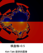 - 超出“逃逸半径”(Escape Radius)时将停止迭代。对于经典 Mandelbrot 集,请使用值 2(或更高)。但是,对于集中的某些变量,较多的迭代次数可能会很有用。使用棋盘格效果时,较大的值会创建更紧密的条带。小于 2 的值也可以用于创建有趣的效果。