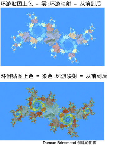 雾(Fog):逐渐融合到颜色渐变值。如果使用“从前到后”(Front to Back)映射,则前期迭代(较大的图像)会显示在前面,并映射到纹理颜色。后期迭代(较小的图像)显示在后面,并映射到右渐变索引。如果使用“从后到前”(Back to Front)映射,则前期迭代(较大的图像)会显示在后面,并映射到右渐变索引。后期迭代(较小的图像)显示在前面,并映射到左渐变索引。