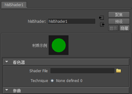 在“Hypershade”中将显示新着色材质,而在“属性编辑器”(Attribute Editor)中将显示“HLSLShader”材质节点。