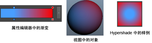 颜色渐变的方向。默认为“V 向渐变”(V Ramp)。以下介绍了选择“圆形类型”(Circular Type)并在“属性编辑器”(Attribute Editor)中调整“渐变”(Ramp)的颜色时会发生的情况(请参见下文的渐变)。