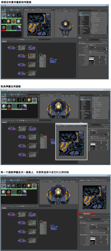 通过停靠、取消停靠和重新排列面板,创建最适合您工作流的 Hypershade 布局。