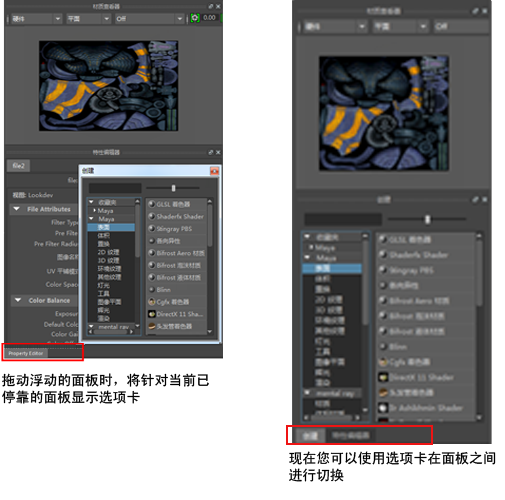 可以将一个面板停靠到另一个面板上,系统会创建选项卡,以便可以在 Hypershade 的同一区域中的面板之间切换。