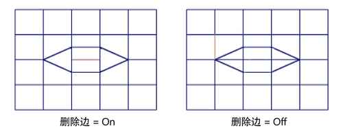 在部分内部循环边上偏移边时,在循环的两端创建的新多边形可以是三边的多边形。启用“删除边”(Delete edge)后,会删除循环的开始边和结束边,以在网格上保持四边拓扑。启用“工具完成”(Tool Completion) -“自动”(Automatically)选项后,“删除边”(Delete edge)选项将不可用。