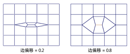 仅当将“偏移循环边”(Offset Edge Loop)设定为用作动作时,“边偏移”(Edge offset)才可用。该选项可确定在选定边的两个相邻边上放置偏移边的距离。“边偏移”(Edge offset)单位基于选定边和两侧的相邻边之间距离的百分比。例如,将“边偏移”(Edge offset)设定为 0.5(默认值)可将偏移边放置在选定边和原始相邻反向边的中间。