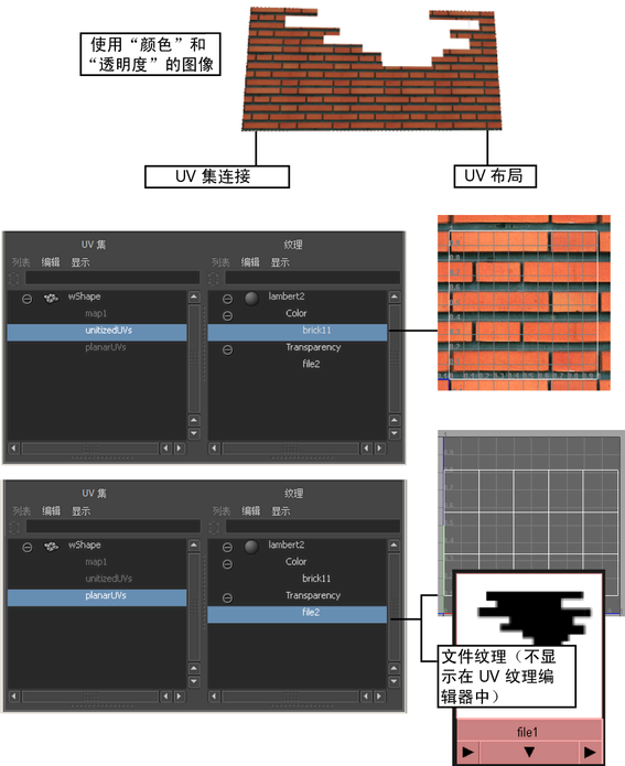 在该示例中,UV 集将连接到材质的不同属性(“颜色”(Color)和“透明度”(Transparency))中的纹理。