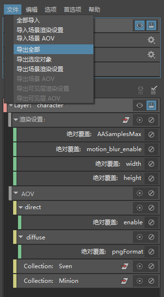 通过“渲染设置”(Render Setup)编辑器的“文件”(File)菜单,可以导出以下任何内容: