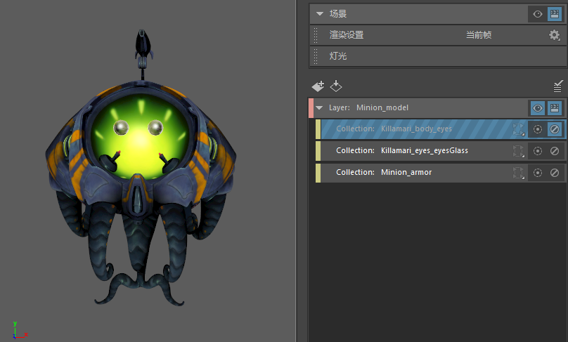 现在,如果反转这两个集合的顺序:如果 Killamari_body_eyes 在层次中位于 Killamari_eyes_eyesGlass 的下面,且 Killamari_body_eyes 设置为已禁用,则 Killamari_body_eyes 集合优先,并且角色的眼睛会从层中排除。