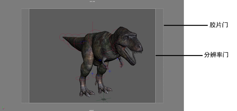 分辨率门表示渲染分辨率(要渲染的区域)。胶片门表示摄影机光圈的维度。在此示例中,分辨率门的纵横比设置为 4:3,而胶片门的纵横比设置为 16:9。此图像演示了分辨率门可以裁剪胶片门。显示这些视图导向可确保您的对象在渲染输出中按需要缩放或框显,并可确保没有对象可裁剪出最终渲染图像。