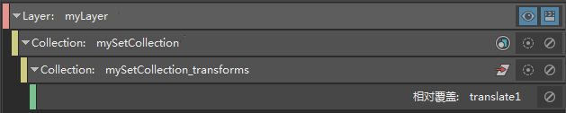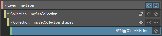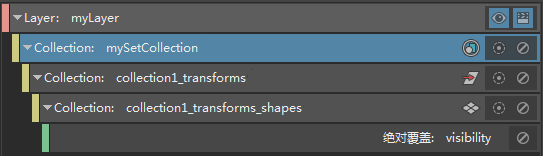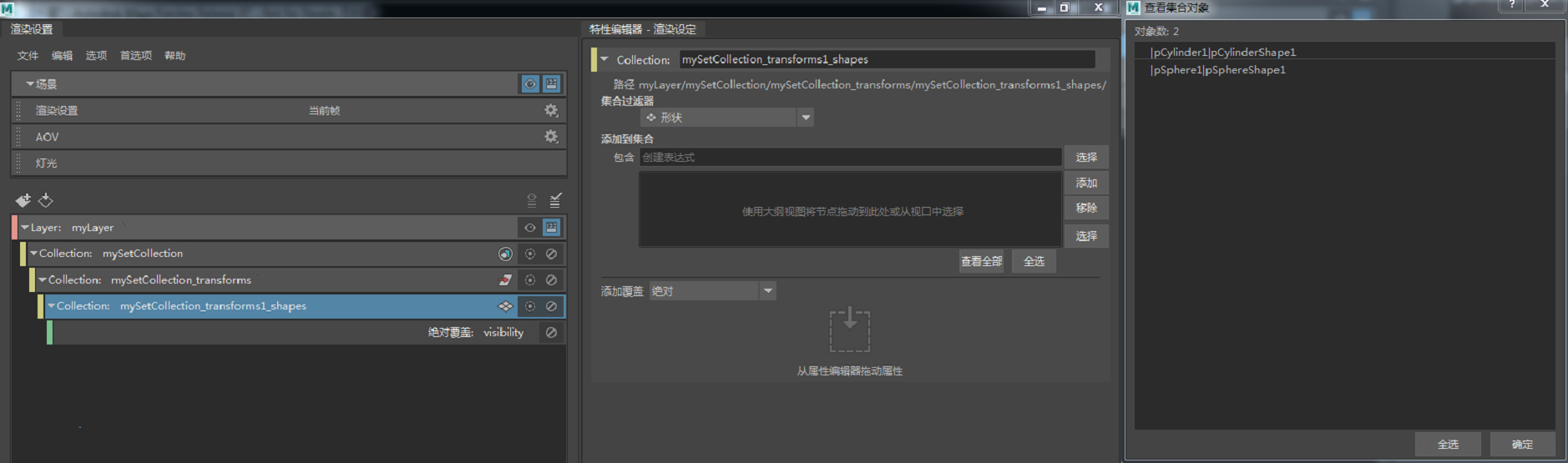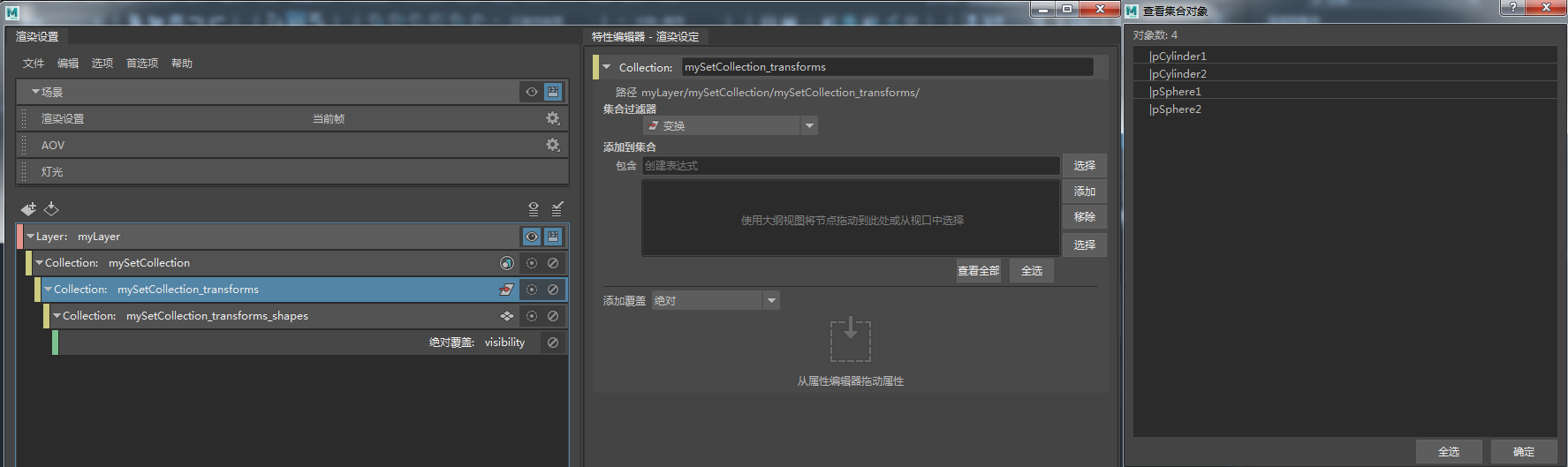在此示例中,set1 添加到 mySetCollection,并且“集合过滤器”(Collection Filters)设置为“集”(Sets)。对“可见性”(Visibility)属性创建覆盖时,将创建 mySetCollection_transforms 子集合,并在其中创建 mySetCollection_transforms_shapes 子集合。针对任一子集合单击“查看全部”(View All)可确定其成员身份包含两个球体和两个圆柱体。