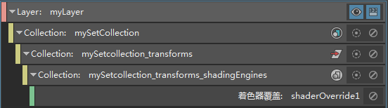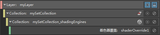 您可以使用类似的工作流创建着色器覆盖。当选择“创建着色器覆盖”(Create Shader Override)时,将自动创建一个包含集成员的变换节点的子集合。在该子集合中,还创建了另一个包含集成员的着色组节点的子集合。