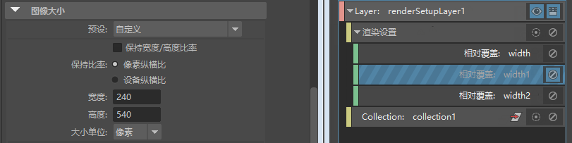 在此示例中,场景层中的“图像大小 > 宽度”(Image Size > Width)属性设置为 960。属性上有三个覆盖。每个覆盖将值乘以 0.5。