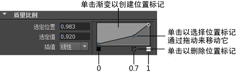 以下单值渐变示例用于调整粒子的质量比例属性。