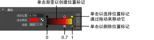 选择位置标记后,您可以单击“选定颜色”色样,以更改颜色或添加纹理在该点。“Interpolation”选项相同的单个值渐变,但变换显示为颜色更改,而不是直线。