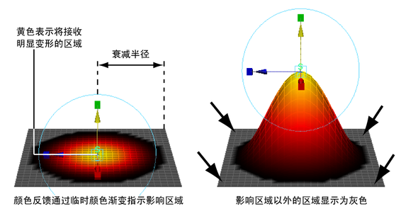 “颜色反馈”(Color Feedback)直观地指出了影响的区域,以及受影响区域内的影响和衰减量。受影响最大的区域(基于“衰减曲线”(Falloff Curve)的形状)显示为黄色。随着变形器的影响逐渐减弱,颜色渐变融合为较深的橙色/红色。影响区域中未变形的区域显示为黑色。“衰减半径”(Falloff Radius)外侧的区域显示为灰色。