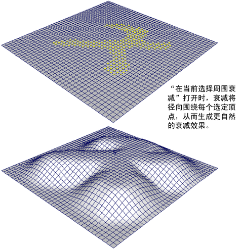 - 在各选定顶点周围呈辐射状进行衰减。这样可以生成一个更自然的衰减效果,尤其当选定顶点构成一个任意形状时。