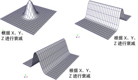 - 变形衰减曲线图的 X、Y 或 Z 轴方向。通过关闭沿一个或多个方向的衰减,可以创建各种效果(例如,渐变、边缘)。