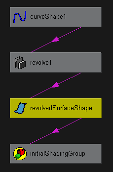 通过旋转 NURBS 曲线可创建酒杯曲面。选择旋转曲面的形状节点并选择“图表 > 输入和输出连接”(Graph > Input and Output Connections)时,将显示以下依存关系图: