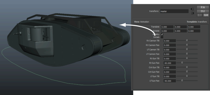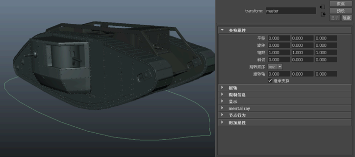 下图中显示在 Maya 中创建的坦克。该坦克的主节点处于选中状态,且该坦克在属性编辑器(Attribute Editor)中以默认视图显示。