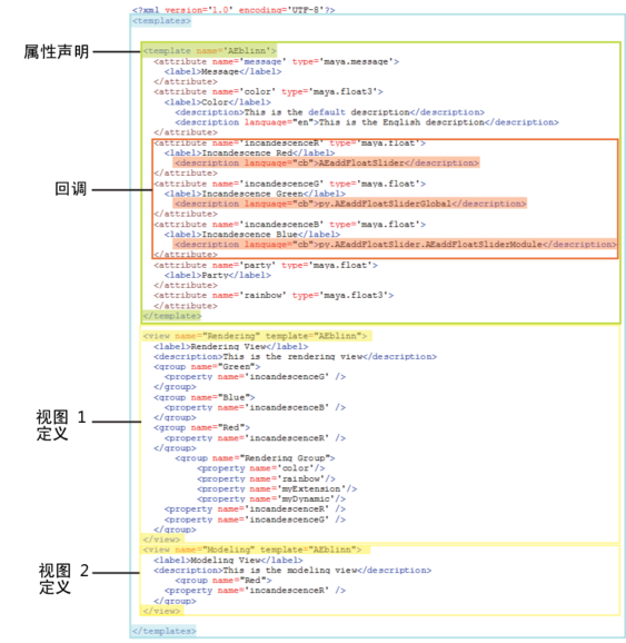 自定义的属性编辑器模板使用由以下元素组成的 XML 结构:
