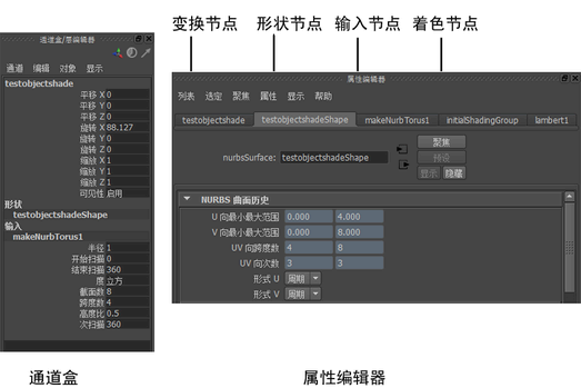 例如,如果选择“创建 > NURBS 基本体 > 球体”(Create > NURBS Primitives > Sphere)来创建球体,则 Maya 将创建出变换节点和形状节点。