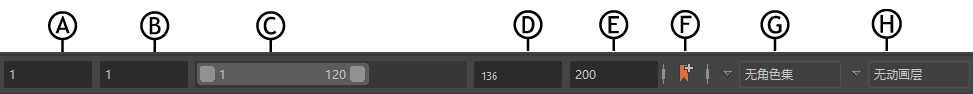 A. 动画开始时间(Animation Start Time) B. 播放开始时间(Playback Start Time) C.“范围滑块”(Range Slider)栏 D. 播放结束时间(Playback End Time) E. 动画结束时间(Animation End Time) F.“时间滑块书签”(Time Slider Bookmark)图标 G. “角色集”(Character Set)菜单 H.“动画层”(Animation Layer)菜单