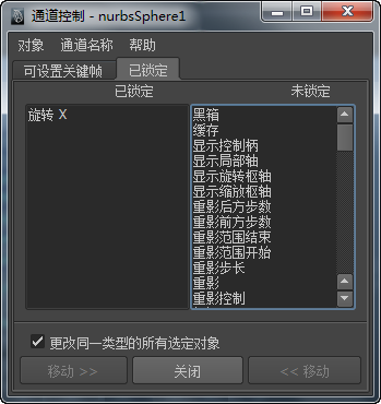 在“通道控制”(Channel Control)窗口的“已锁定”(Locked)选项卡中管理属性的过程与在“可设定关键帧”(Keyable)选项卡中所使用的过程相同。