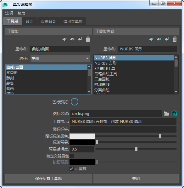 | 重命名工具架 | 在工具架编辑器的“工具架”(Shelves)部分中,选择要编辑的工具架,然后在“重命名”(Rename)文本框中输入新名称。 |