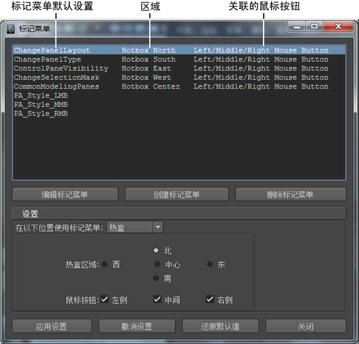 使用此编辑器可编辑可用的标记菜单。定义标记菜单后,必须将其指定给热键或将其添加到热盒中,才能使用它。