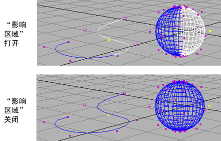 该选项允许启用或禁用影响区域的显示。“影响区域”(Region of effect)是随移动的选定 CV 潜在更改的对象的一部分。请注意,曲线将显示影响区域和曲面。默认设置为启用。