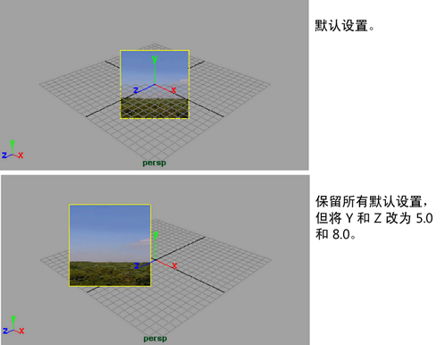 相对于胶片门水平和垂直“偏移”(Offsets)图像平面。“偏移”(Offset)在“图像平面”(Image Plane)设置为“固定”(Fixed)时不可用。“偏移”(Offset)以毫米为单位。默认值都是 0。