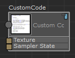 若要创建“自定义代码”(Custom Code)节点,请从 ShaderFX 菜单栏中选择“设置 > 切换高级模式”(Settings > Toggle Advanced Mode)以启用高级模式,然后选择“硬件着色器节点 > 各种 > 自定义代码”(Hw Shader Nodes > Various > Custom Code)。默认情况下,“自定义代码”(Custom Code)节点包含两个输入:“纹理”(Texture)和“采样器状态”(Sampler State)。每个此类输入的方形端口表示它可以接受多个输入。此节点可以让您从纹理读取像素。默认情况下,没有针对节点的输出。