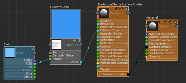 在此简单的示例中,输出是输入颜色乘以输入颜色。“自定义代码”(Custom Code)样例显示的蓝色比通过 inputA 连接的蓝色要深。