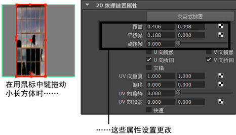 当拖动操纵器控制柄时,UV 向重复、偏移和UV 向旋转的属性设置将在 place2dTexture 的“属性编辑器”(Attribute Editor)中发生更改。这样可以让您如墙纸一般拉伸、收缩、移动和旋转纹理。