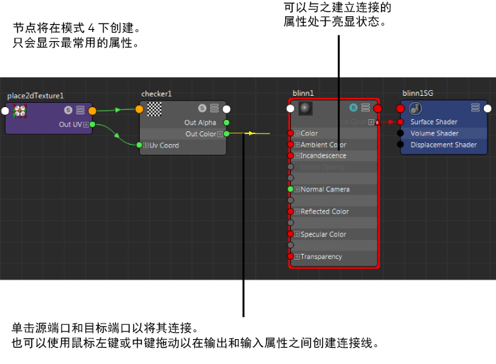默认情况下,在 Hypershade 中首次创建节点时,将显示其最常用的属性(节点编辑器中的热键 4 模式)。