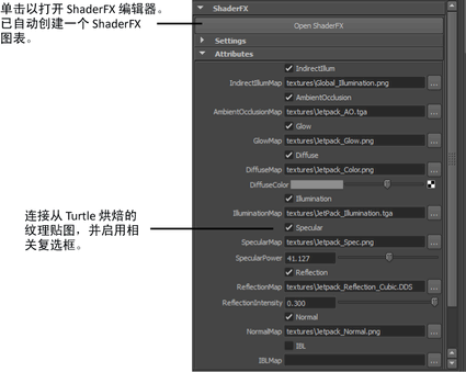 - 将纹理贴图连接到 Maya ShaderfxShader“属性编辑器”(Attribute Editor)的 Attributes 部分下的相应属性。还必须启用关联的复选框,纹理贴图才能生效。