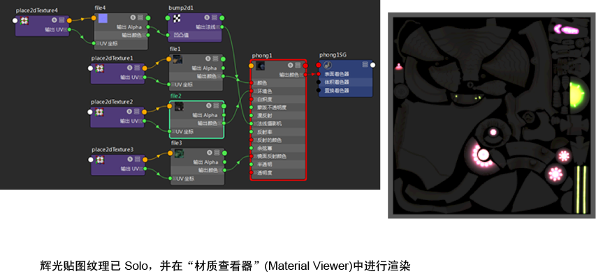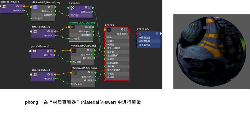 在此示例中,可以选择图表中的任何节点,以在材质查看器中查看网络 (phong1) 的下游结果。在“材质查看器”(Material Viewer)中渲染的节点由红色边界表示。