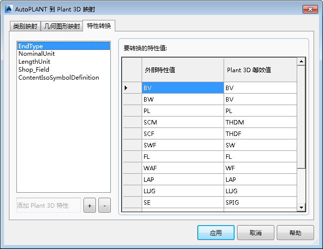 指定从左窗格上列表中选定的特性的 Plant 3D 等效值。在如图所示的对话框中。例如,AutoPLANT 端点类型特性值 BW 映射到(转换为)Plant 3D 语言中的 BV。