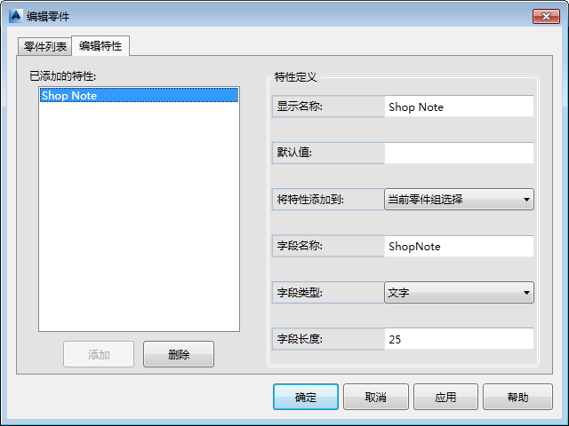 添加新特性,并设置等级库中的当前选定零件或所有零件的特性定义。