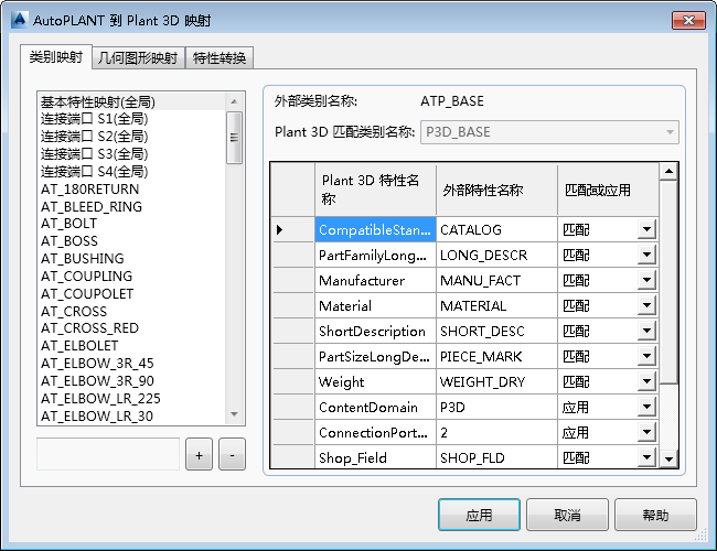 将全局和单个类别 AutoPLANT 特性映射到 Plant 3D 等效特性。