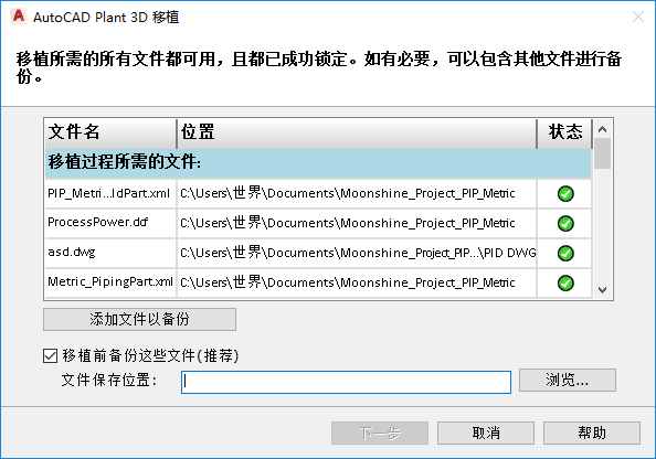 系统会搜索 AutoCAD P&ID 2009 项目成功移植所需的所有文件。表中会动态显示每个文件的名称、位置路径和状态。 表示成功锁定的文件,而 表示仍未锁定的文件。