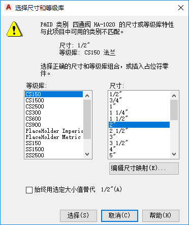 - 如果尺寸或等级库不匹配,请在“选择尺寸和等级库”对话框中,执行以下操作: