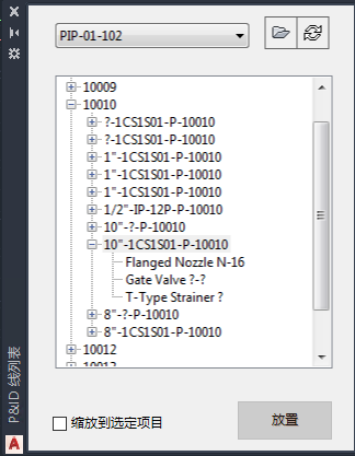 可以从“P&ID 线列表”中选择阀、管件和在线设备,并在模型中放置映射的 Plant 3D 对应对象。