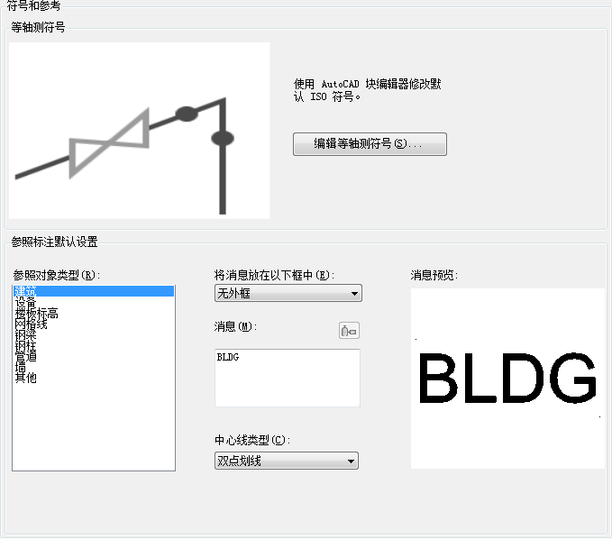 编辑创建等轴测图形时使用的符号。为 ISO 参照标注设置默认特性和文字。