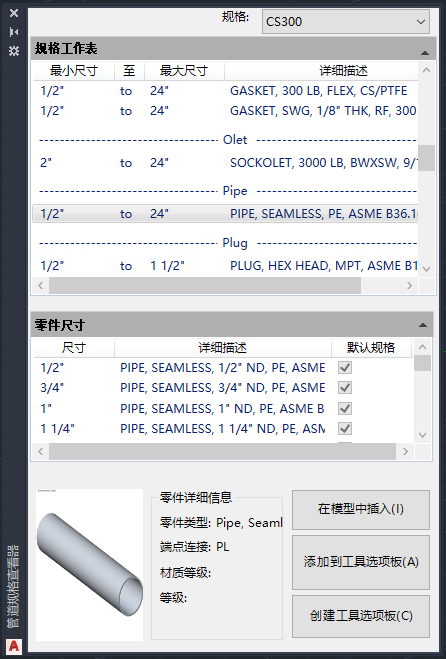 显示 AutoCAD Plant 3D toolset 中的当前等级库,并使您可打开并查看等级库工作表,将等级库工作表中的零件插入到模型中,以及修改工具选项板。