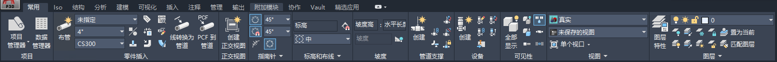 三维管道“常用”选项卡是“三维管道”工作空间的一部分。