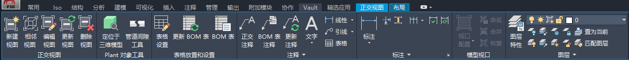 “正交视图”上下文选项卡是“三维管道”工作空间的一部分。