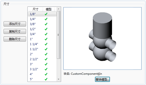 在元件库编辑器中,使用自定义几何图形创建元件。指定该新元件的管道元件类别和其他固定特性。生成初始尺寸范围。添加和删除尺寸以匹配自定义元件块。输入每个尺寸的自定义几何图形。